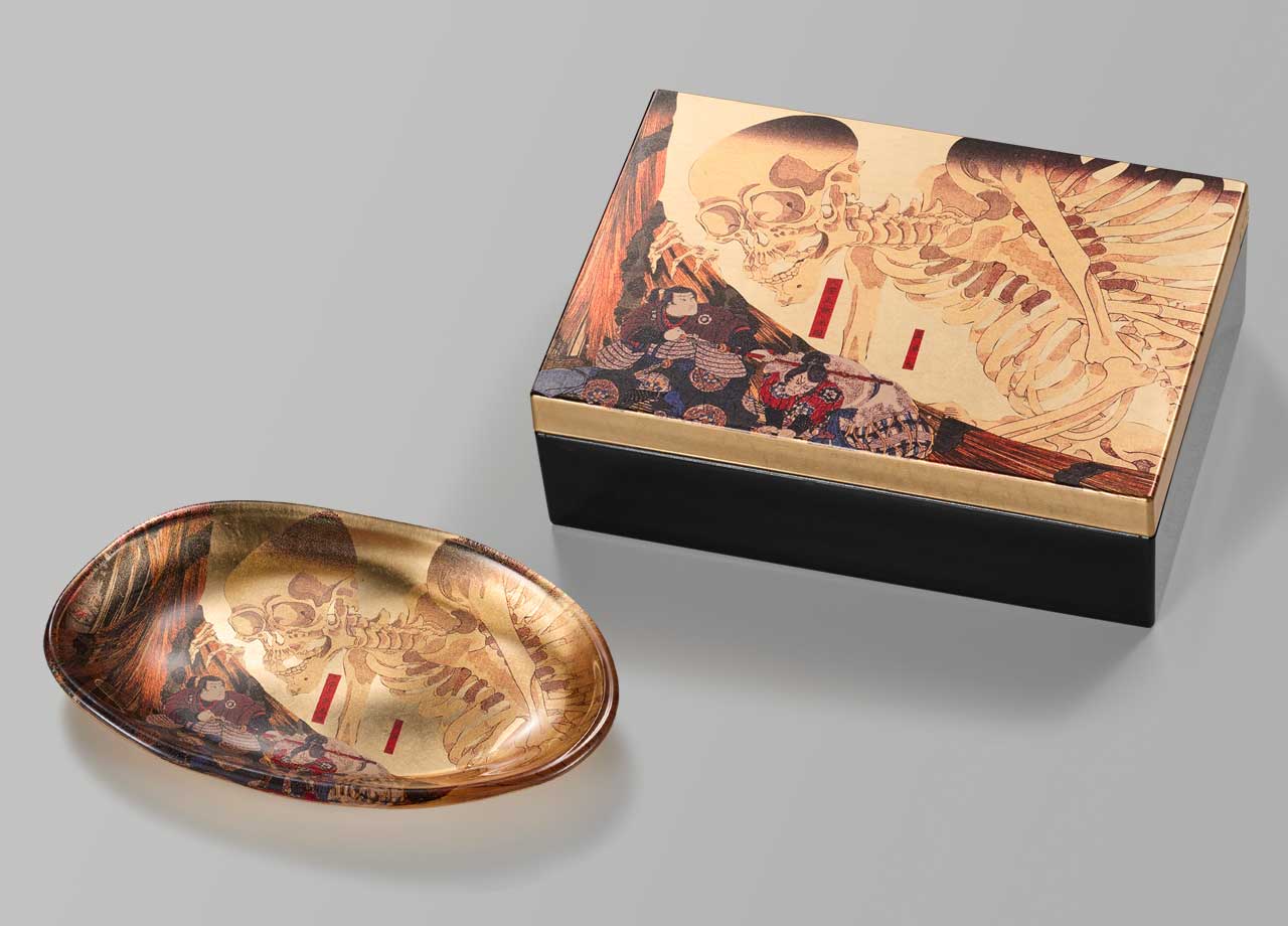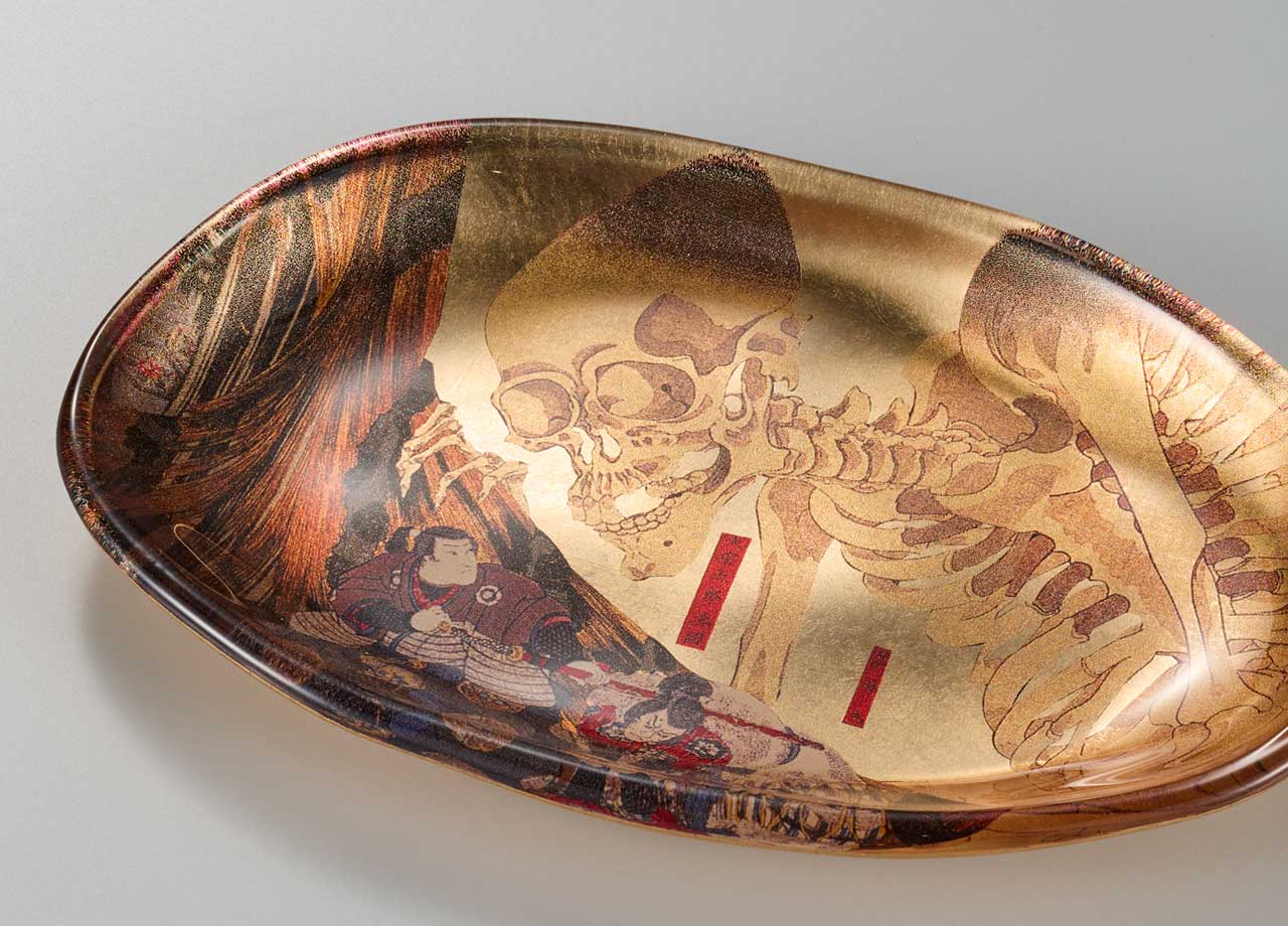 This glass tray features Takiyasha the Witch and the Skeleton Specter, one of the most striking and unconventional ukiyo-e works, depicting a gigantic skeleton that continues to fascinate audiences with its bold and eerie presence. Through the refined craftsmanship of applying gold leaf to glass, the design captures the ghostly shimmer of the golden skeleton, evoking both mystery and elegance. Not only a functional accessory tray or key tray, it also serves beautifully as an interior accent to display your favorite small items—bringing a touch of Japanese art into your daily life.